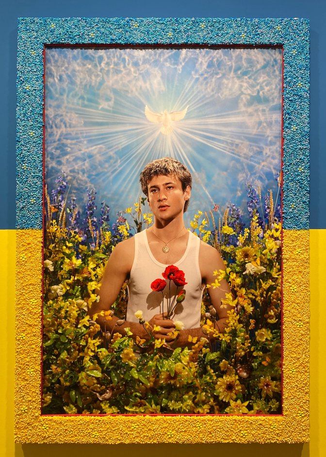 Dans « La promesse », le modèle pleure au milieu d’un paradis perdu, mais à retrouver, fait de fleurs jaunes et bleues. Il tient un bouquet de coquelicots, rouge sang, symbole de la consolation et surtout symbole de commémoration de la Première Guerre Mondiale. La colombe de la paix et l’auréole donnent des allures religieuses, les tableaux du baptême du Christ étant la référence : le jeune est reconnu par une instance supérieure et reçoit une promesse, une mission de libération. Mais contrairement à beaucoup de leurs œuvres où la nudité est présente, le modèle est habillé toutefois de manière spécifique : un débardeur, appelé Marcel, que portaient les acteurs des 60’s comme Marlon Brando et qui est entré dans la mode homosexuelle. Avec cette œuvre, les artistes expriment leur empathie pour un peuple, représenté par sa jeunesse, qui souffre. L’iconographie religieuse vient accompagner la visée politique. Pierre et Gilles mélangent tous les registres, ils ne veulent pas de pureté stylistique. La guerre en Ukraine, qui les touche beaucoup, n’est pas abordée sur un mode cruel ou trash, mais presque mystique, avec introduction de force lumière, qui joue souvent un grand effet dans les œuvres. Les artistes qui expriment facilement l’amour le font, ici, pour un peuple.