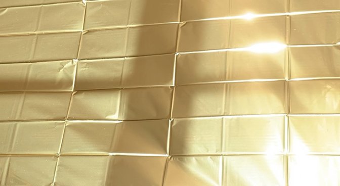 L’humour poétique : Thibault Lucas est un adepte des petits déplacements d’objet ou de concept. Le titre Vitrine tient de l’évidence. Le fait que l’on n’y comprenne rien et que l’on doive se baisser dans la position ridicule de voyeur pour découvrir ce qu’elle cache ? Le doré est un signe de richesse, ici la couverture de survie vaut quelques euros ! Une tente a une porte. Ici ce sont les murs. Absurde ! Sous la grande tente se trouve une autre petite. Et sous cette dernière ? En outre la lumière du jour et de la nuit font apparaître l’œuvre différemment. Parfois le soleil se reflète directement sur la vitre, puis sur la toile. On ne voit rien ! Et c’est beau.