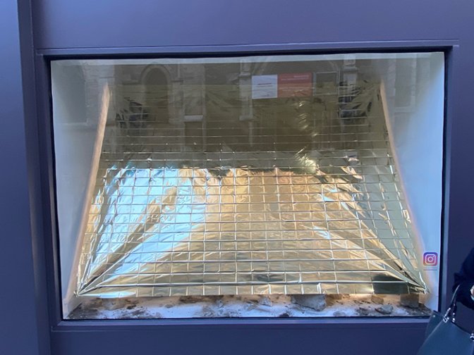 La capacité à s’adapter aux lieux. C’est probablement la constante de l’action artistique de Thibault Lucas, mais toujours à contre-emploi en jouant sur les échelles de perception. Dans sa conception de l’in situ, il révèle tout autant l’objet ou le sujet que l’espace occupé. Son Instagram est plein de ces projets troublants. Dans le cas de « Vitrine », c’est bien sûr la notion de vitrine qu’il interroge aussi en la saturant de brillant. Que voit-on ? Une vitrine occultée au milieu d’un grand mur gris, le temps du montage d’une nouvelle exposition ?
