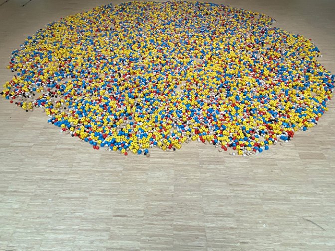 Cette œuvre de dimension variable, pouvant occuper un disque de 5 à 9 m de diamètre, est constituée de 5 000 dés de couleurs différentes, mais dont toutes les faces ne comprennent qu’un point. Conçue dans l’esprit Fluxus, ce courant des années 60 touchant tous les arts, elle se caractérise par un sens aiguisé de l’improvisation, de la performance, ludique à premier abord, mais en fait très sérieuse. D’ailleurs, l’artiste, ayant accédé au bouddhisme, l’a réalisée après une retraite de trois ans. C’est un pied de nez au hasard, car la vie finit toujours de la même façon, pour tous les humains, quelle que soit leur couleur.