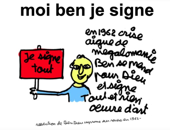 Cette œuvre, avec sa faute d’orthographe, s’inscrit dans une longue tradition de Ben, celle de tout signer et de jouer à Dieu. En 1961, il publia une revue d’art total « Dieu ».