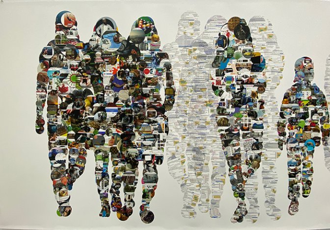 Avec son installation Portant (2017), l’artiste-anthropologue convoque alors des silhouettes d’anonymes en taille réelle, bien qu’individualisées par le contour de leur corps imprimé sur vinyle, pour former un ensemble de singularités dont les dénominateurs communs du numérique constituent des flux de données et d’informations qui les connectent. Les innombrables images fragmentaires qui ont laissé leur empreinte – indélébile ? – sur ces profils colonisés donnent à voir une réalité vertigineuse où le déplacement se fait sur une ligne du temps en constante progression.