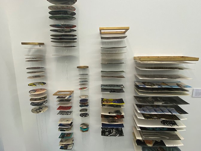 Cheminées (2022). Si l’on n’ose pas un tel détachement avec notre propre réalité, Sandrine Saïah renverse les cadres et le champ visuel frontal traditionnel de notre espace physique avec la structure Cheminées pour redonner du souffle, du rythme, en déployant une succession verticale d’images.
