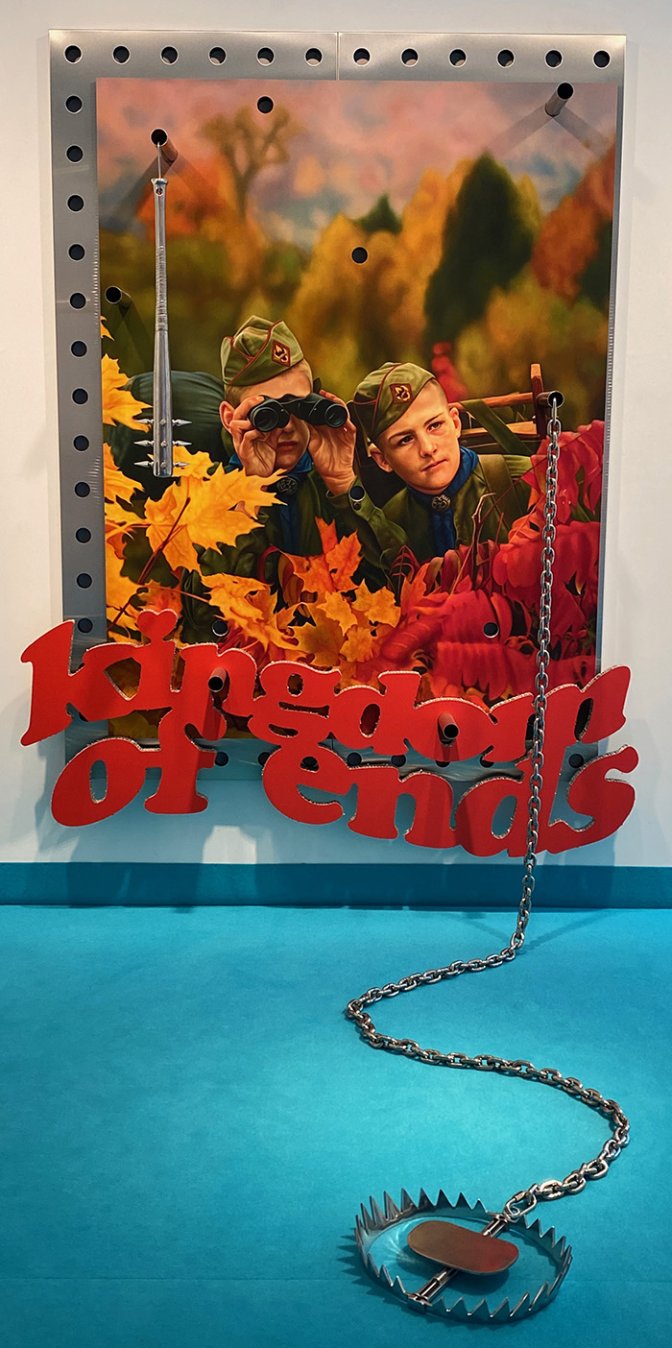Il est intéressant de noter une différence de scénographie de la violence dans la même galerie Templon entre cette exposition de Robin The Kid et celle de Pierre et Gilles fin 2022(Lire V&D). À l’entrée dans l’espace le duo français avait accroché un tableau d’une jeune Ukrainienne >>>au milieu des blés surgissant avec une arme, pour signifier la mobilisation et l’espoir d’un peuple ; The Kid, quant à lui, place deux jeunes s’amusant à faire la guerre, presque avec la même tonalité que dans l’idéologie visuelle rosâtre mao.