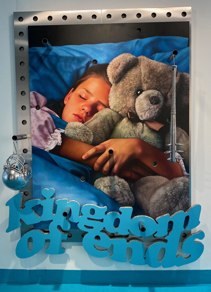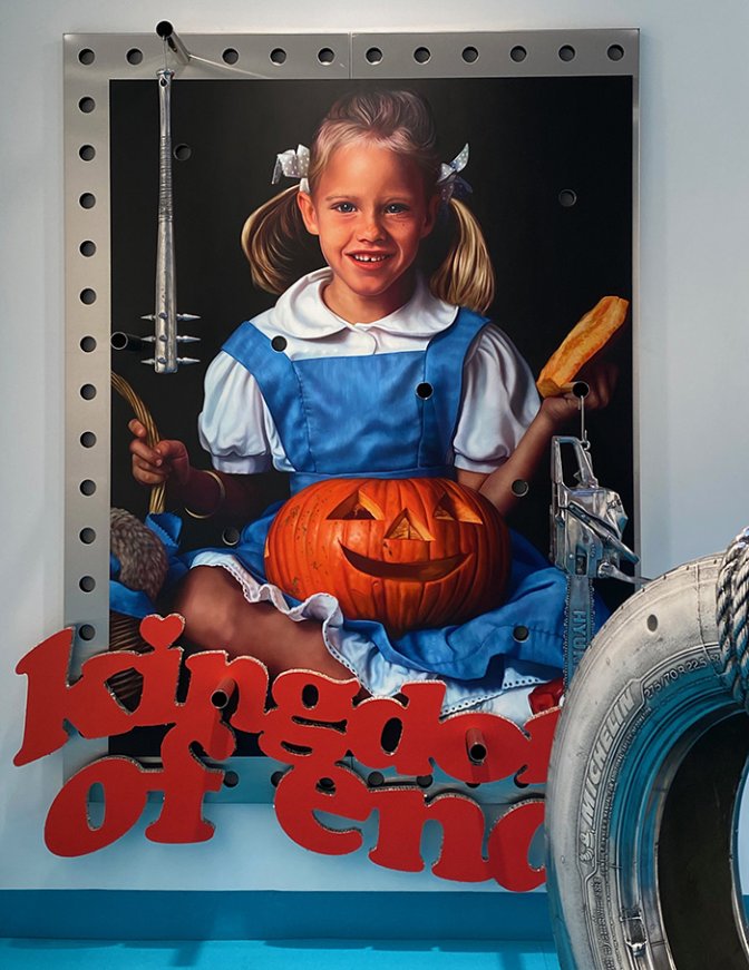 Ici l’hyperréalisme, encore lui, associe la peinture, la sculpture, l’installation. Tout semble rieur et sent bon la vie et le rêve des enfants ; or, avec des armes accrochées sur les grands portraits et des reproductions en aluminium de divers objets, la violence est latente et dit beaucoup de choses sur la société américaine ou plutôt la manière dont l’artiste la ressent.