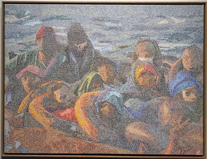 Les tableaux, élaborés à partir de photos, expriment la diversité des rapports que les personnages, ici tous masculins, entretiennent avec la mer qui polarise leurs regards, comme leur avenir. Leur singularité tient au fait qu’ils se focalisent sur l’origine territoriale des migrations, et moins sur le passage risqué vers l’Occident.