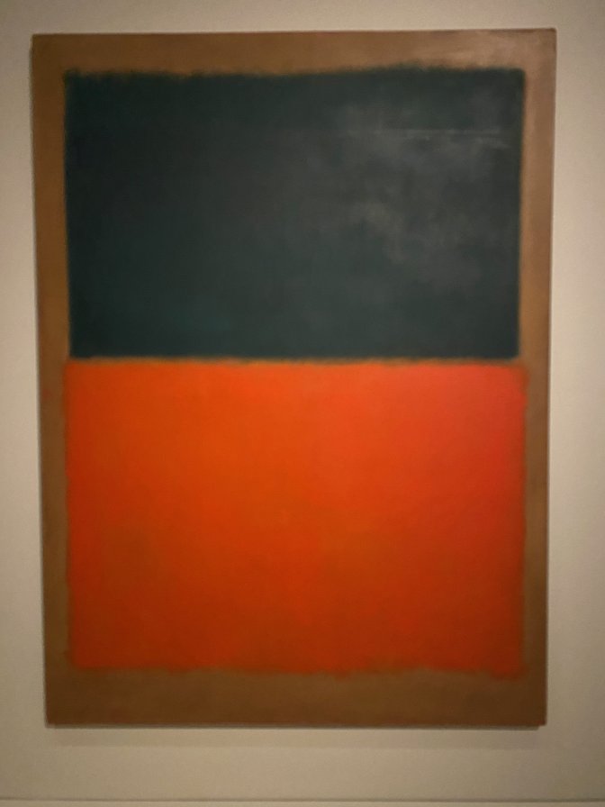 Rothko concevait des installations avec des bancs pour offrir des moments de méditation comme dans la reconstitution de la « Rothko Room » de la Phillips Collection, avec entre autres « Green and Tangerine on Red » de 1956. Ses deux rectangles distincts, émergeant de la surface picturale, sans geste visible sur la toile, avec son effet de sfumato et ses bords doux, procurent une impression d’immersion et évoque nos émotions contradictoires comme le disait Rothko.