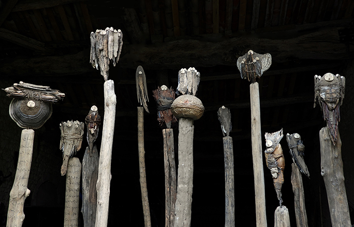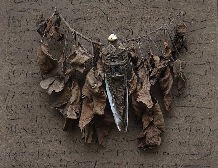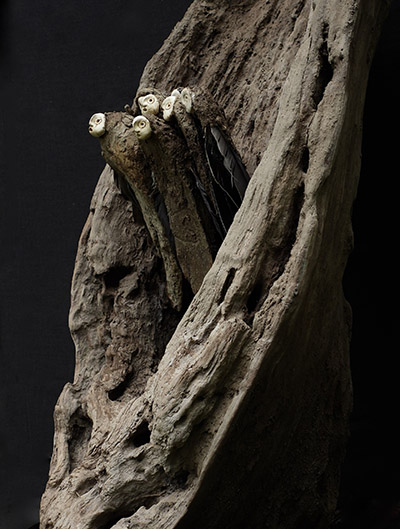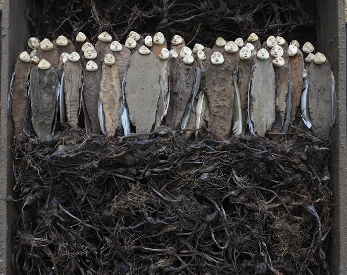 Le voilà promeneur, chasseur cueilleur de fragments d’écorces, de racines mises à nu, de feuilles tombées, de mousses roussies, de bogues et d’écales, de plumes aussi et de toutes sortes de brisures de bois mort qui l’attendaient et qu’il emporte. Dans l’atelier, naissent les premières figures, gardant toutes, ce même visage blanc. Il en fait des anges et des rois et des reines parmi la foule des autres : le peuple de l’Arbonie se dresse.