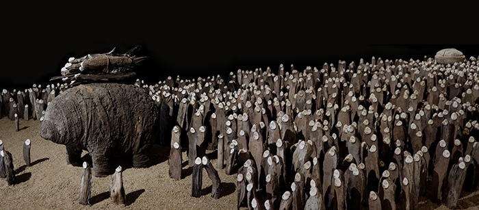 En petits groupes ou en solitaires, ces êtres de feuilles vont se déposer au creux d’une souche, se répandre telle une armée sur un vase terrain de terre, se perdre dans un fouillis de racines. Parfois, il en offre un à la forêt et l‘abandonne au pied d’un chêne, d’un hêtre, d’un noisetier. Mais peu à peu, ce peuple se fait nomade. Il avance, avec lenteur semble-t-il, en procession, entourant un chariot sur lequel, Jephan de Villiers a déposé une sorte de cosse géante couverte d’une écriture inventée, des arboglyphes. On ne saura rien de ce qu’elle contient. Rien de ce qui est écrit. Mais l’artiste y a bien déposé quelque chose.