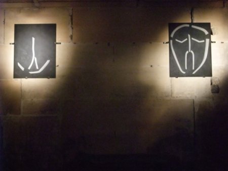 Deux plaques de marbre noir de Volos (Grèce) entaillées, des lignes épurées, relevant du dessin à main levée, immédiat et définitif à la fois. Des traits blancs révélés au cœur même d’une matière plane, noire et mate. Des signes qui surgissent, se lèvent et se lisent en mouvement, en visage, en personnage, en symboles …
