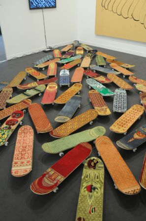 Maximum sensation est un ensemble de planches de skate recouvertes d’un tapis de prière. Un geste d’humour ? De l’ironie ? Une critique de qui ?