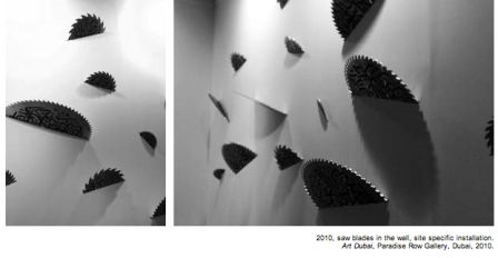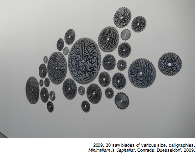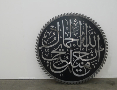 Mais si vous allez sur le site de l’artiste, vous pouvez constater que cette calligraphie a été utilisée pour une autre œuvre, autrement plus ambigüe, car agressive et belle à la fois, « Machinery, Dieu est beau », ’’lame de scies circulaire, calligraphies, 2009.’’