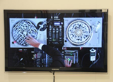 MixologyMixology, est une vidéo (11’) tout aussi intrigante : une prise de vue des mains d’un DJ qui fait tourner des disques peints de calligraphies sur une console des plus modernes, et cela non pas sur le son d’une musique religieuse, ou de versets du Coran psalmodiés comme dans l’exposition Traces, mais du Beethoven et notamment des extraits de la Neuvième Symphonie. De l’universel dans du divertissement ? Exit la religion ?