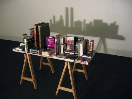 Si vous aimez cet artiste et sa puissance d’interpellation du regard, allez voir Save Manhattan 01, qui est une œuvre emblématique tant par son propos que par sa force visuelle, simple et efficace. Il place sur une table toute une littérature d’ouvrages parus après la chute des Twin Towers auxquels s’ajoutent deux exemplaires du Coran. Le tout est éclairé de manière à ce que l’ombre projetée des livres sur le mur dessine l’horizon new-yorkais d’avant la catastrophe. Les symboles du capitalisme sont ainsi renvoyés dos à dos avec ceux de l’intégrisme religieux.