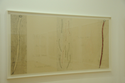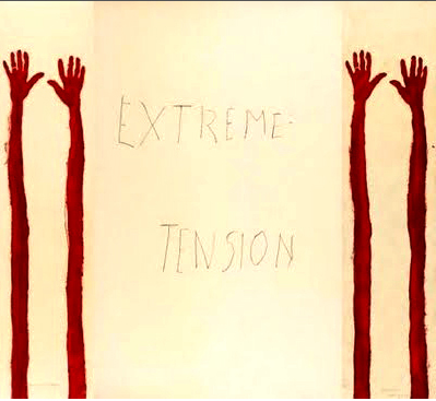 Réalisé en 2007, Extrême tension se présente comme un grand dispositif composé de onze panneaux de formats différents, associant des estampes rehaussées de peinture et de grandes feuilles de papier sur lesquelles figurent des mots et des phrases écrits en anglais par la main tremblante de l’artiste, alors âgée de 95 ans.