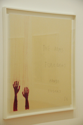 La représentation de la main rythme le cycle. Les mains rouges du premier panneau réapparaissent sur le septième, mais ici elles ont glissé vers le bas de la feuille, en y laissant des traces : cependant elles s’agrippent toujours au papier – c’est-à-dire à la vie. La main peut fonctionner comme le signe du destin. C’est elle qui tient le crayon, qui indique le chemin, qui attrape et qui lâche ; elle emprisonne les mots délivrés comme des cris intérieurs. Les traces de doigts, d’un rouge passé, s’apparentent aux marques laissées par un captif enfermé dans la feuille de papier. La légèreté du médium graphique et l’économie de moyens dont use l’artiste atténuent la pesanteur du drame et donnent à l’ensemble une fluidité organique.