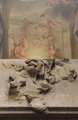 Le baroque c’est aussi le mélange des genres. Ne faisait-on pas chanter des opéras féminins par des hommes au XVIIIe ? Le genre architecture n’était-il pas mêlé avec la conception des grands paysages ? À Saint-Merry, l’interférence des disciplines et arts est exprimé dans le tableau de Coypel : c’est un trompe-l’œil, l’architecture des colonnes se prolonge dans la peinture, le lanterneau réel de la chapelle est peint.