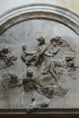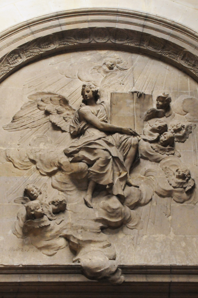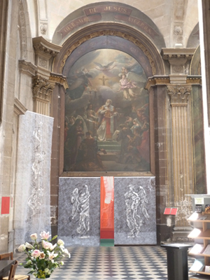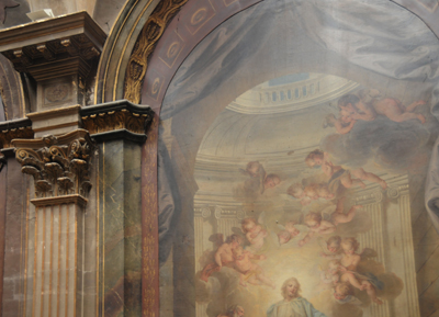 Lorsque l’on visite la chapelle de Communion, on aperçoit immédiatement les anges sculptés par les frères Slodtz, ainsi que les angelots du tableau de Charles Coypel (1749), « Les pèlerins d’Emmaüs ».