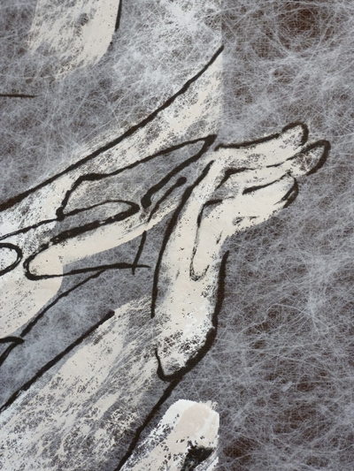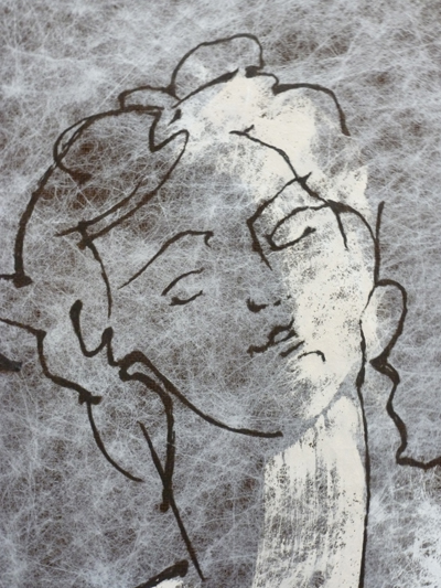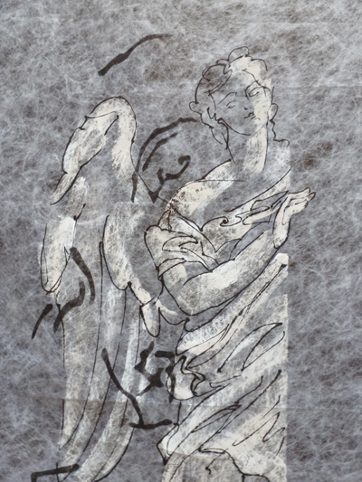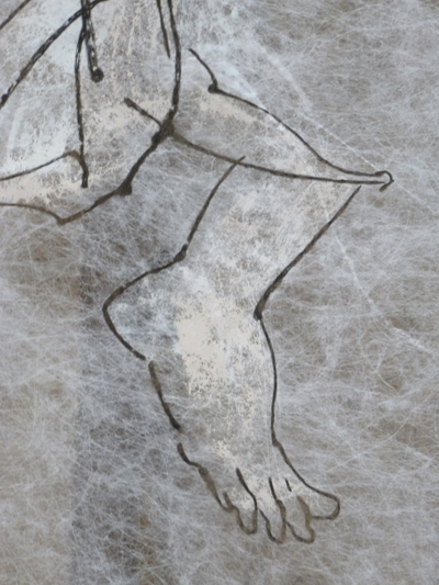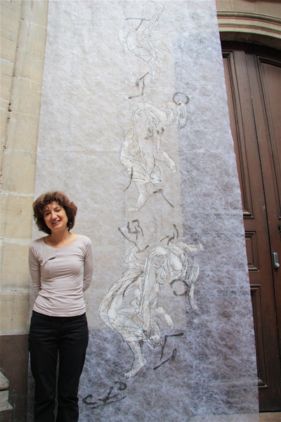 Elle utilise l’encre avec d’autres medias très contemporains : le tissu non tissé, l’acrylique. Elle est bien dans le registre baroque, avec la saturation de la chapelle en œuvres, frisant le risque de l’alourdissement, des contre-plongées, les exagérations de mouvement, sa volonté d’aller chercher la lumière des lanterneaux, la tension des corps. Mais elle épure les formes du baroque en affirmant avant tout les traits des personnages, la peinture étant inexistante, sauf pour rehausser les contours.