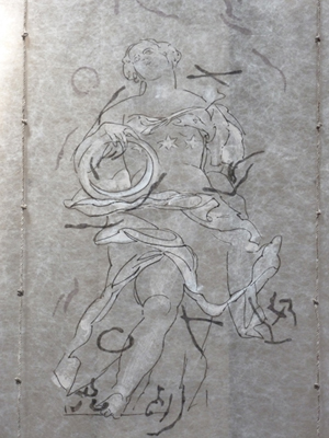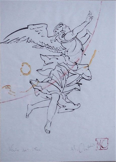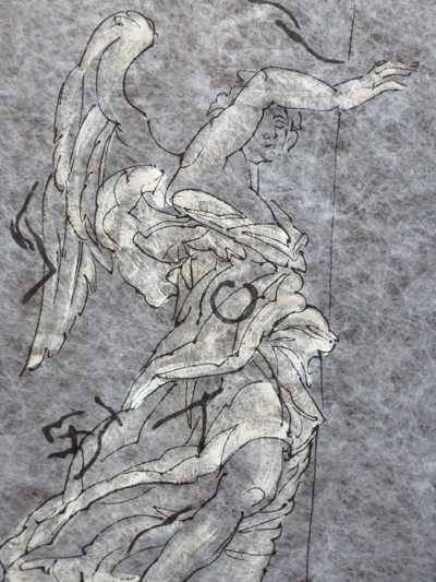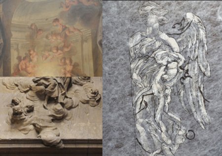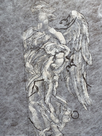 Ce qui semble l’intéresser, ce n’est pas le symbole, éventuellement réinventé, de l’ange, mais le mouvement, l’élévation de la matière, l’évocation des sculptures baroquse romaines transformées en dessin pour une église parisienne.