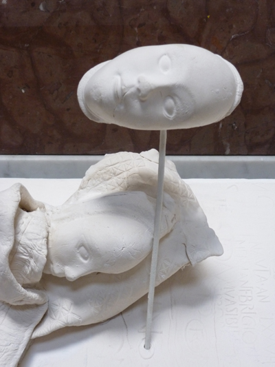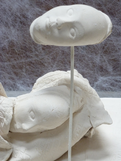 Pour signifier l’origine de cette élévation, Martine Chittofrati a déposé la petite sculpture d’un dormeur, ainsi qu’une échelle stylisée en corde, sur le rebord du monument à la guerre de 14-18, accolé au mur de la chapelle et qui est donc voilé le temps de l’exposition.