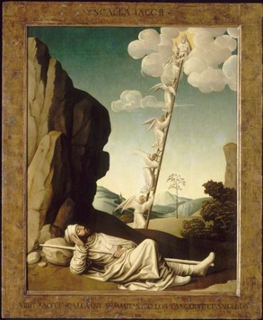 Du grand texte de la Genèse sur Jacob, elle ne traite que du songe où figurent une échelle et des anges, où intervient une promesse de bénédiction de Dieu et de don d’une terre (Gn 28, 10-17- texte en fin de dossier à télécharger ). Elle ne traite pas de l’autre épisode plus dramatique du combat avec l’ange qui a inspiré de nombreux artistes, comme Rembrandt et Delacroix dont le tableau est à voir à Saint-Sulpice ; elle ne traite pas non plus du changement de nom de Jacob, le tortueux, en Israël, la droiture.
