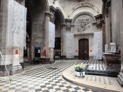 La spécificité de cette œuvre a tenu à son installation dans un lieu qui est lui-même baroque, la chapelle de Communion aux œuvres majeures que sont les sculptures des frères Slodtz et le tableau de Charles Coypel, les Pèlerins d’Emmaüs.