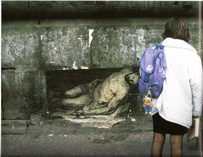 Martine Chittofrati ne cache pas son admiration à l’égard d’Ernest Pignon-Ernest, (lire article de V&D sur une récente exposition : Extases) qui a truffé les murs les plus ordinaires de Naples de ses affiches, œuvres liées à l’endroit où elles ont été peintes. Ce maître du baroque contemporain a une posture engagée : il fait des œuvres de situations (les tragédies de Naples) bien plus qu’il ne peint sur le motif.